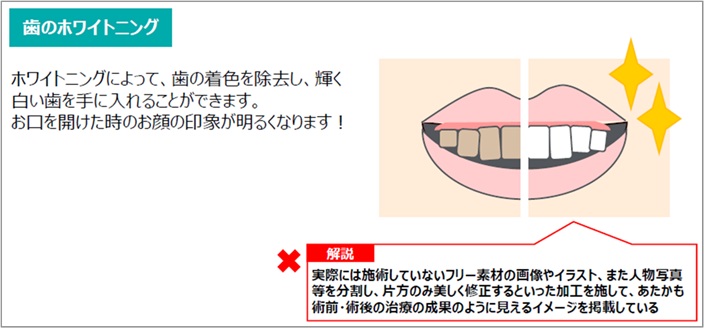 「加工・修正した術前術後の写真等」の掲載や「絶対安全な手術」「○%の満足度」などの表現、治療後の定期的な処置等が必要であるにもかかわらず、全ての治療が短期間で終了するといった内容の表現は、虚偽広告として取り扱う。