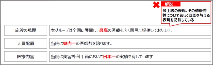「日本一」「No.1」、「最高」など、特定又は不特定の他の医療機関(複数の場合を含む)と自らを比較の対象とし、施設の規模、人員配置、提供する医療の内容などについて、自らの医療機関が他の医療機関よりも優良である旨を示す表現は、仮に事実であったとしても優良性について国民・患者を誤認させ、不当に誘引する恐れがあるものであり、Webサイトに掲載すべきではない。