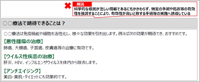 なお、「国民・患者を誤認させ、不当に誘引する恐れがあるもの」とは、国民・患者がWebサイトに掲載されている内容から認識する印象・期待感と実際の内容とに相違があることを常識的判断としていえれば足りるものであり、国民・患者が誤認することを証明することや、実際に誤認したという結果までは必要としない。