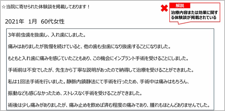 治療等の内容又は効果に関して、患者自身の体験や家族等からの伝聞に基づく主観的な体験談の広告をしてはならない。医療広告ガイドラインでは、こうした体験談について医療機関への誘引を目的として紹介することは、個々の患者の状態等により感想が異なり得るものであり、誤認を与えるおそれがあることを踏まえ、医療に関する広告としては認められない。